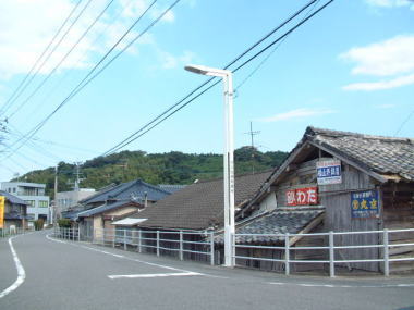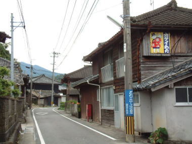 天草の旧道の特徴を表しています。 島の周囲には、このような狭い幅の道路が通っています。 旧道も結構残っており、昔ながらの家屋も比較的 健在なのですが、看板は少ししか残っていません。 やはり、離島であったことが、看板の掲出数を 妨げたのかもしれません。 昭和41年に天草五橋が開通し、それにともなって 国道も整備されていったと思います。 このような集落の旧道をバイパスで迂回しています。 「モントリオ」看板は、そういったバイパス側に 貼ってありますので、昭和41年〜45年ころに 貼られたものと推察されます。 撮影地:熊本県有明町赤崎 |