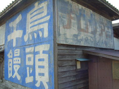 「高砂わた」さんの一文字看板です。 「高」の文字が落ちています。 だるまわたも一文字看板を掲出していました。 特に野立て看板は、台風などの大風で よく倒れていました。 「ま」の文字が抜けていると間抜けわたとなり みっともなくなります。 一文字看板は見栄えはしますが 欠点も大きいのです。 撮影地:熊本県有明町上津浦 |