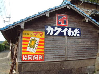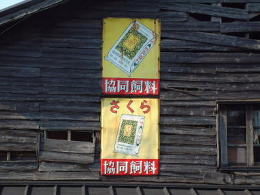 それにしても商品の外見をそのまま描かれているのに 一瞬、お菓子の看板かと見間違えてしまうのは 私だけでしょうか。 たしかに、ホームセンターに売ってあるペット食品は とても、おいしそうなパッケージにしてあります。 この飼料は牛用なのでしょう。(自信は全くありませんが) 看板掲出当時は、まだ輸入肉骨粉の使用は してなかったのでしょうか。 撮影地:熊本県小国町宮原 |