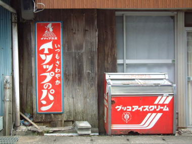 イソップ製菓さんの「イソップのパン」看板です。 イソップ製菓さんは天草の本渡市に会社があります。 天草に行きますと、この「イソップのパン」看板を いたるところで見かけます。 天草を代表する看板といえます。 この看板は画像のように袖看板と貼り看板の 両方の掲出方法がされています。 これは、看板の仕様が周囲のふちを平らにした鉄板の 構造にしてありますので、垂木を挟んで袖看板にも 出来るようにしてあるからです。 また、塗装方法が山陽・山陰編の 「小野田セメント」看板と同じ製造方法であります。 いわゆる琺瑯看板の部類には入らないと思われます。 撮影地:熊本県有明町大島子 |