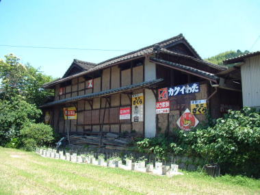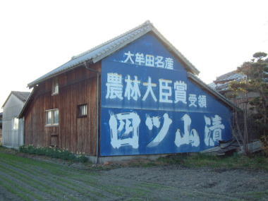 ’四ツ山漬’さんのとても大きな看板です。 壁面いっぱいに貼り付けてあります。 ’四ツ山漬’は、今や貴重なたいらぎの貝柱を 粕漬けにした珍味です。 粕漬では大牟田市には他に’有明漬’さんもあります。 ’有明漬’さんの看板は福岡県編に掲載しています。 また柳川市には’水産堂’さんもあります。 ’水産堂’さんの看板は風景/福岡県編に 掲載しています。 撮影地:福岡県高田町今福 |