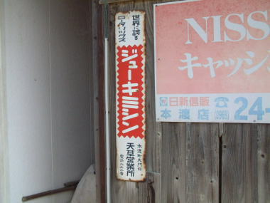 山鹿市のツツジの名所である日輪寺入口近くに ある看板屋敷です。 イカリソースの一文字看板が欠落していて残念です。 水俣市にも欠落したイカリソース看板があります。 一文字看板は揃っていれば見栄えがいいのですが 欠落すると本当に間抜けになります。 だるまわた縦文字看板が横面に隠れていますが 貼ってあります。 撮影地:熊本県山鹿市八幡 |