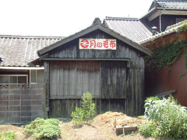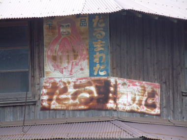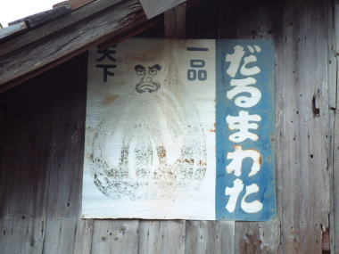 1号看板(なれの果て) これは、間違いなく1号看板なのですが 場所を変えられて 壁板代わりに使われています。 山口市本由良のJR山陽本線沿いにある家を調べて みたところ、見つけました。 だるまわた看板は広島県呉市まで 掲出した記録が残っています。 そこが、東端になります。 |