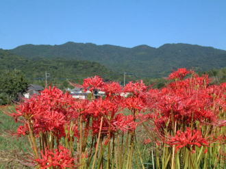 荒尾市府本より見た小岱山 荒尾市府本は小岱山の中央登山口に なります。 また、小岱焼の窯元が数軒あります。 左側の一番高いところが筒ヶ岳です。 また、鞍部右側の高いところが七峰台 さらに観音岳と続いています。 彼岸花の背景に写してみました。 9月16日撮影 |