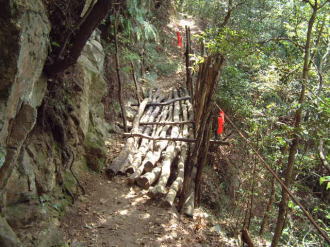 丸太橋 筒ヶ岳から山腹を伝うように道があります。 その道の途中にある小岱山で唯一の 危険地帯の橋があります。 小岱山は初心者向きの山で 気軽に登れる山です。 4月28日撮影 |