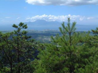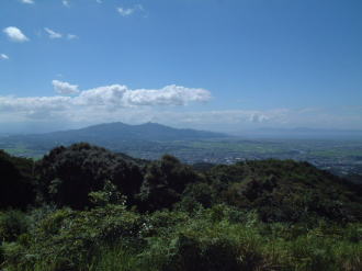 観音岳から見た熊ノ岳 熊本市の西側にそびえる熊ノ岳を 見たところです。 手前には玉名市街が見えています。 右側の海の向こうに見える低く連なった山は 有明海と不知火海(八代海)とを分ける 宇土半島になります。 8月15日 |