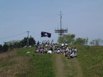 三池山山頂付近の電波塔 三池山山頂の南側は草地が広がっています。 ちょうど三池工業高校の鍛錬登山と 一緒になりました。 三池公園から縦走してきたと言っていました。 ちなみに、私は普光寺からの直登コースでした。 4月27日撮影 |