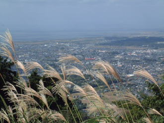 三池山山頂から見た大牟田市街 ススキの穂が、きれいになびいています。 大牟田市北部の市街地を見たところです。 さらに、有明海も見えています。 今年のノリ養殖はどうなるのでしょうか。 10月14日撮影 |