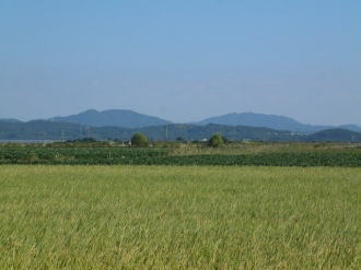 大和町皿垣より見た三池山と小岱山 福岡県大和町皿垣は 矢部川の北側に広がる干拓地です。 一面に水田が広がっており 秋になると稲穂がみごとに実ります。 左側が三池山、右側が小岱山になります。 手前の低い丘陵は 大牟田市北部の甘木山です。 |