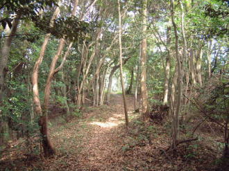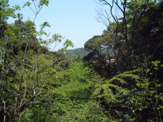 小岱山の中腹 小岱山は九州のほとんどの山と同じく 常緑広葉樹におおわれた南北に広がる 周囲が約30キロほどの小さな山です。 山の中に入ると、だいたいこんな感じです。 4月28日撮影 |