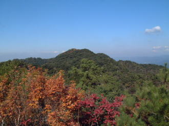 長助金毘羅から見た三池山 長助金毘羅は小岱山の北側の高い峰で あるため、三池山が最も近くに見えます。 ちょうど、標高差にして100mあります。 少し見下ろすような感じになります。 10月7日撮影 |