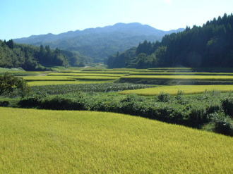 南関町四ッ原より見た小岱山 上の鳥居から左へ進んだ谷の様子です。 こちらからは、筒ヶ岳とその前にある 長助金毘羅が見えます。 もうじき稲刈りが行われるのでしょう。 9月16日撮影 |