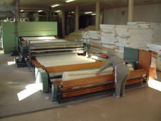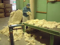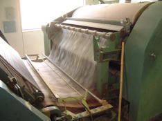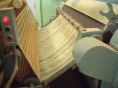 2.クリーナーへ充填 羊毛原料の重量を 計測しクリーナーの ベルトコンベアに 載せていきます。 |