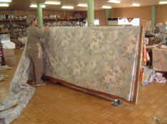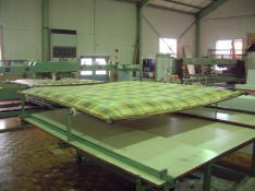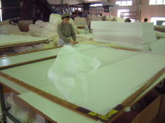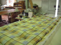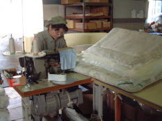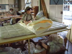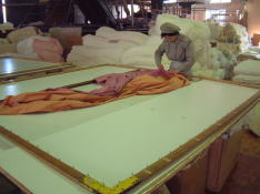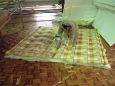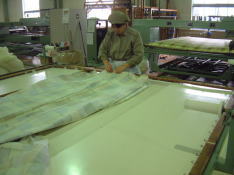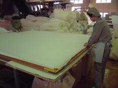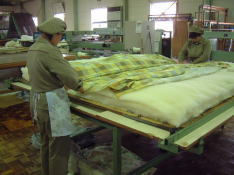 28.ピンかけ 三層タイプ敷ふとんの 作業は、始めに不織布を 木枠のピンにかけて いきます。 |