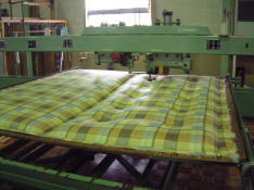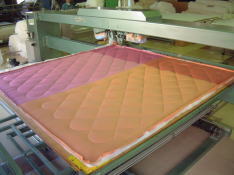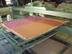 31.キルト コンフォーターミシンで 木枠に張った生地とわたを キルトしていきます。 |