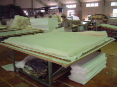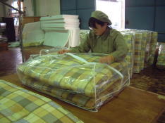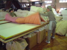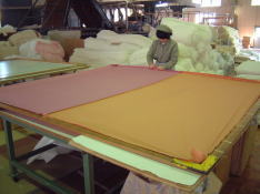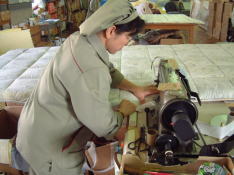43.テープ付け 三層タイプの敷ふとんは 40.の状態から、まず周囲を 中芯を入れるところを残して テープ付けしていきます。 |