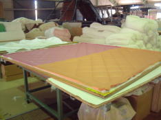 52.中芯を載せる 成型わたの上に中芯を 載せます。 シングルサイズは2枚 一度にキルトしますので 中芯を2枚載せます。 |