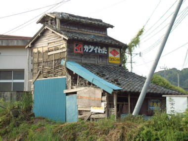 「高砂わた」さんの一文字看板です。 「高」の文字が落ちています。 だるまわたも一文字看板を掲出していました。 特に野立て看板は、台風などの大風で よく倒れていました。 「ま」の文字が抜けていると間抜けわたとなり みっともなくなります。 一文字看板は見栄えはしますが 欠点も大きいのです。 撮影地:熊本県有明町上津浦 |