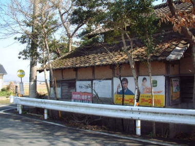 由美かおると水原弘の看板が並んでいます。 田舎へ行けば、よく見る光景であったと言われます。 掲出の時期は、おそらく昭和40年代であると思います。 わた屋の看板は比較的初期の昭和30年代に 多くの看板が掲出されています。 看板を捜していきますと、大塚関係など後期の看板が わた屋の看板の上に重ねるように貼ってあるのを よく見かけます。 それによって、年代測定も出来るわけです。 撮影地:熊本県鹿本町中富 |