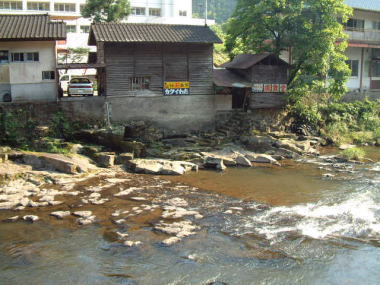 小国町の両神社境内前を流れる田の原川対岸の 珍しい位置に貼ってあります。 よくもこんなところに貼ったのだと感心してしまいます。 田の原川の上流に黒川温泉があります。 撮影地:熊本県小国町皿山 |