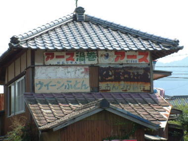 美祢のおたふくさん 時代の流れの中でレトロ看板が消滅していくのも 看板を捜していくうちに頷けるようになりました。 50年前の家屋で、看板の生命ともいえる 壁板が張り替えられることもなく そのまま残っていない限り 確実に消えていく運命にあるのです。 撮影地:山口県美祢市重安 |