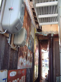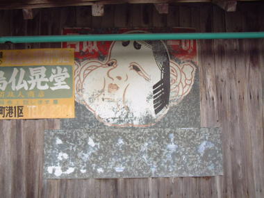 1号看板(なれの果て) これは、間違いなく1号看板なのですが 場所を変えられて 壁板代わりに使われています。 山口市本由良のJR山陽本線沿いにある家を調べて みたところ、見つけました。 だるまわた看板は広島県呉市まで 掲出した記録が残っています。 そこが、東端になります。 |