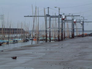 |  | B有明海環境問題 堂面川河口にある漁港岸壁より見た初島方面 有明海の、のり不作問題はとても深刻のようです。 コンテナヤードのような施設は おそらく、のり網を荷役するための リフトだと思われます。 船は繋留されて人影がありませんでした。 |