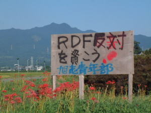 |  | 菊池郡旭志村に掲げられたRDF化施設 建設反対のメッセージです。 菊池市・七城町・旭志村は大牟田リサイクル発電鰍フ 参加市町村になっています。 おそらく旭志村にRDF化施設が建設される 計画になっているのでしょう。 きれいな彼岸花が咲いていますが ここは、彼岸花街道として整備されています。 また、背景の山は鞍岳です。 由来は見てのとおり、馬の鞍の形をしているからです。 |