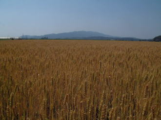 玉名市梅林より見た小岱山 撮影地の玉名市梅林は小岱山の南部を 東西に流れる菊池川の南側にあります。 5月は麦の収穫期で刈り取られたあとは 田植えがされて緑の水田に様変わりします。 5月19日撮影 |