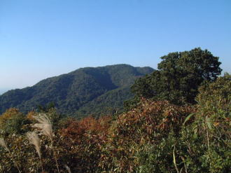 三池山から見た小岱山 小岱山が、すぐ近くに見えます。 左側の高いところが、長助金毘羅 真中の高いところが、筒ヶ岳になります。 後ろに少し顔を出しているのは 熊ノ岳になります。 10月14日撮影 |