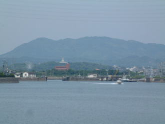 三池港より見た三池山 三池山を三池港外港岸壁より見たところです。 三池山山頂は右側ののっぺりしたところが 山頂になります。 左側の突き出した頂上は三池宮上宮の あるところになります。 三池港は干満差の大きい有明海にあります。 画像やや左側の開いたところは 内港との出入り口になる閘門で、満潮時には ご覧のように開いています。 その閘門の上に白く見えるのは 動物園と桜の名所である延命公園の 配水塔になります。 |