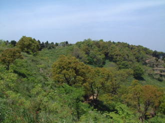 小岱山の中腹 小岱山は九州のほとんどの山と同じく 常緑広葉樹におおわれた南北に広がる 周囲が約30キロほどの小さな山です。 山の中に入ると、だいたいこんな感じです。 4月28日撮影 |